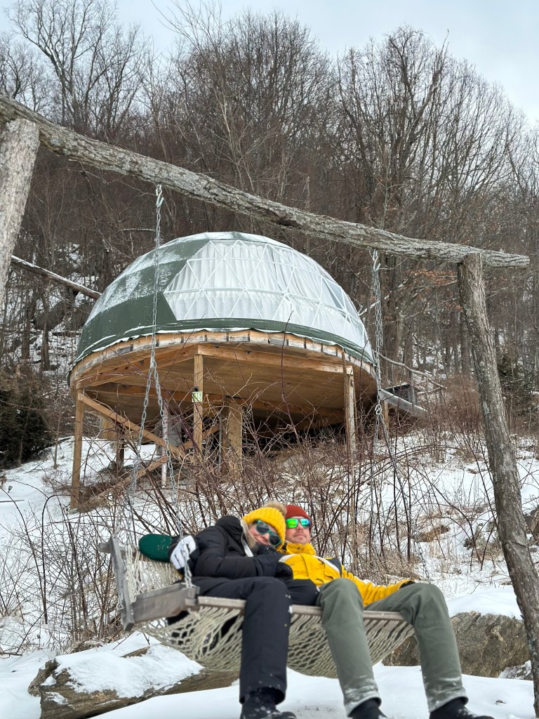 My husband and I were fortunate enough to take our trip in the middle of winter during a blizzard. We parked our car less than 30-feet from our dome entrance and unloaded our supplies, storing them in the safety and warmth of the dome. Eager to explore the grounds, we wrapped our scarves tighter, pulled our snow pants higher, and trekked through the snow. The Glamping Collective has five miles of private hiking trails that led to some pretty amazing snow-covered views. We took the Ridgeline Trail as it was the shortest before starting a bonfire in their community space. The logs were precut, snow-covered, and waiting for us. It was easy-peasy to start with their handy lighter and fire starters available.