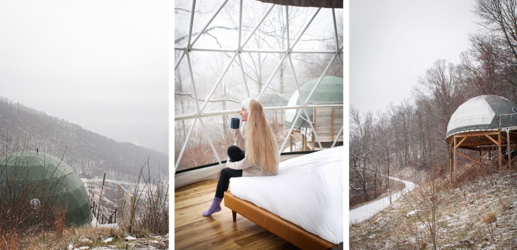 Picture an igloo, but transparent on one side with floor-to-ceiling views of the stars, the snow, the changing leaves, or whatever season the great outdoors is featuring. Western North Carolina is always beautiful. On the cusp of the Great Smoky Mountain National Park, the breathtaking peaks are covered in trees that change from dark green pine in winter to lush green leaves in summer. If you’re more of an autumn person, you’ll find plenty of fiery reds and oranges here as well. No matter what time of year, you can see it all from The Glamping Collective’s private 160-acres.