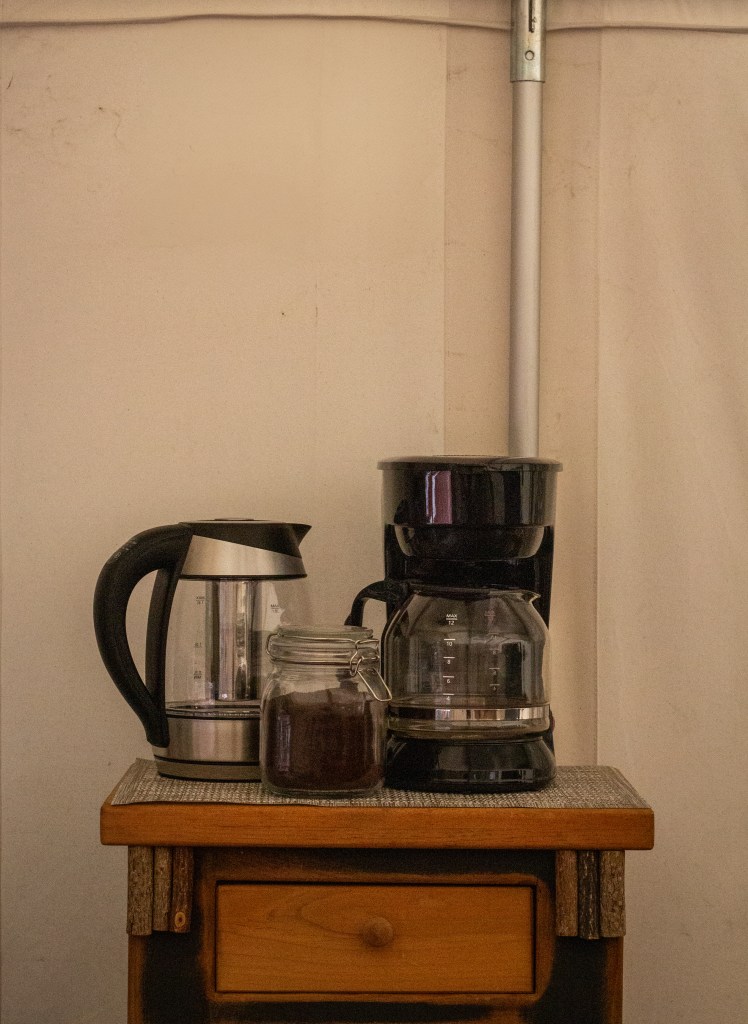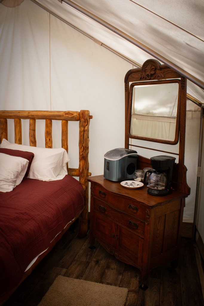 In each tent is an ice maker, coffee maker, hot water kettle, rugs, chairs, electric blankets and a wood fired mini stove for heat. Some glamping sites have one or two of these things, but this list puts Simply Glampin’ in a new category of “comfort.” What’s more, they have power inside their tents for lamps, charging phones, working on laptops, amazing wifi that works really well unless it rains (HA), and the best part— indoor, private, full-bathrooms for each tent and two public bathrooms for community or guest use. The power and indoor bathrooms alone made this stay 10/10 on individuality.