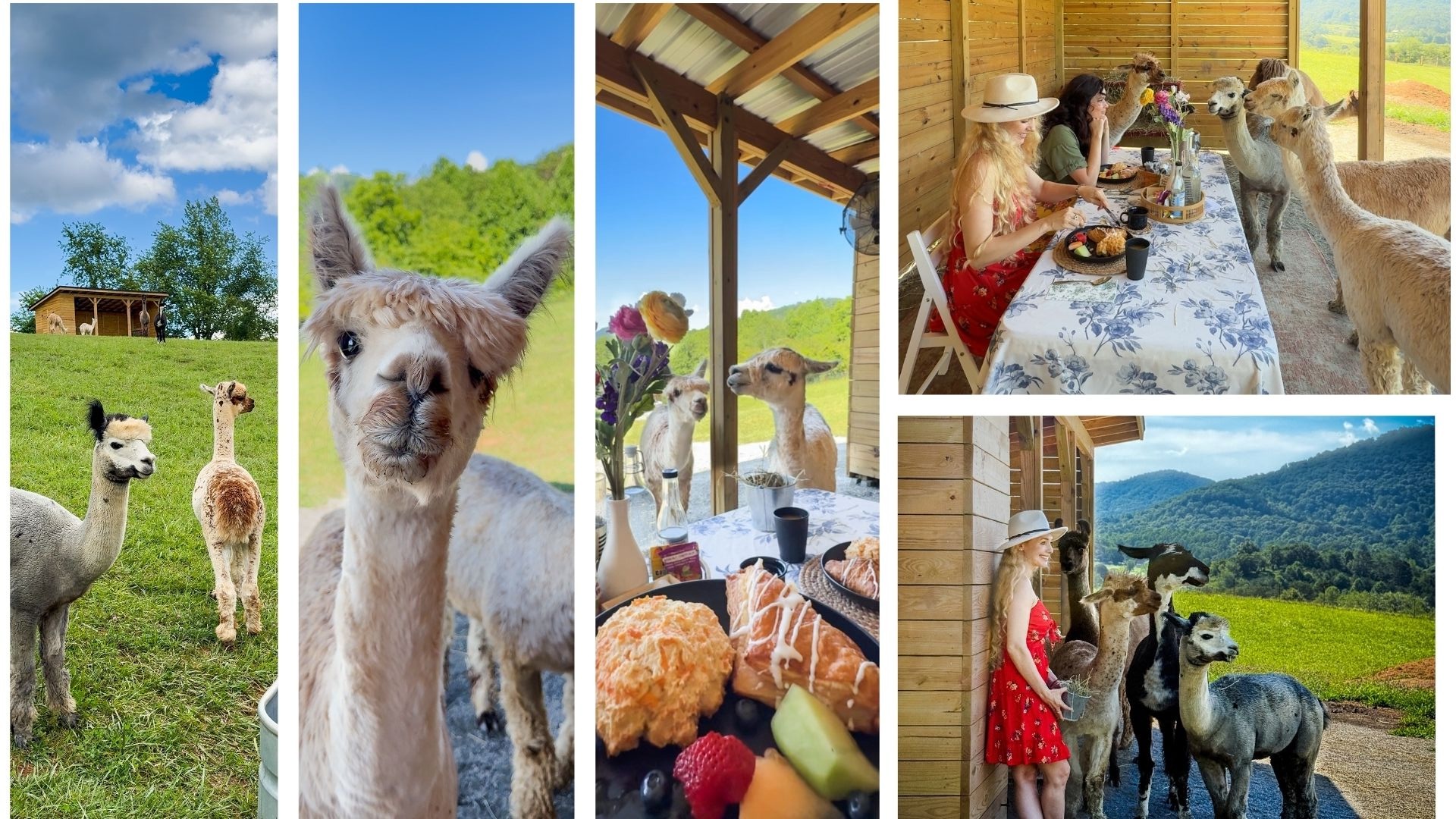 The fenced-in pasture is complete with rolling hills, wild flowers, and a stunning view of the Blue Ridge Mountains. The Smokys, to be exact. When you arrive for the alpaca brunch, you are greeted with a bucket of treats, escorted to a sturdy, well built wooden shelter, and introduced to “the boys.” Two llamas named Heartbreaker and Brinkley, and four alpacas named Ralph, Scully, Hotline and Micah. If your’e lucky and schedule your brunch at the right time, you can help feed these furry friends. They are the absolute sweetest as well, timid at first, they warm up quickly and will even take food and treats from your hand.